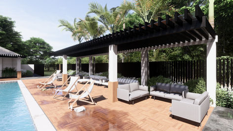 'Communal Synergy' is a tribute to shared experiences and collective energy flow. This project transformed a common area into a vibrant hub of community life, fostering connections and enhancing well-being. At the core of the design is a large, welcoming pool, encompassed by ample loungers, serving as a serene nucleus of communal interactions. Further facilitating the flow of energy, an outdoor dining and grilling area promotes shared meals and lively exchanges. Custom-built bench seating allows for casual meet-ups, while the open play grass area provides a versatile space, catering to spirited games or tranquil sun-drenched picnics. Deck tiles elegantly frame the pool, contributing to the harmonious and inviting tropical aesthetic. 'Communal Synergy' embodies a fusion of function, beauty, and communal energy, creating an environment where connections flourish.